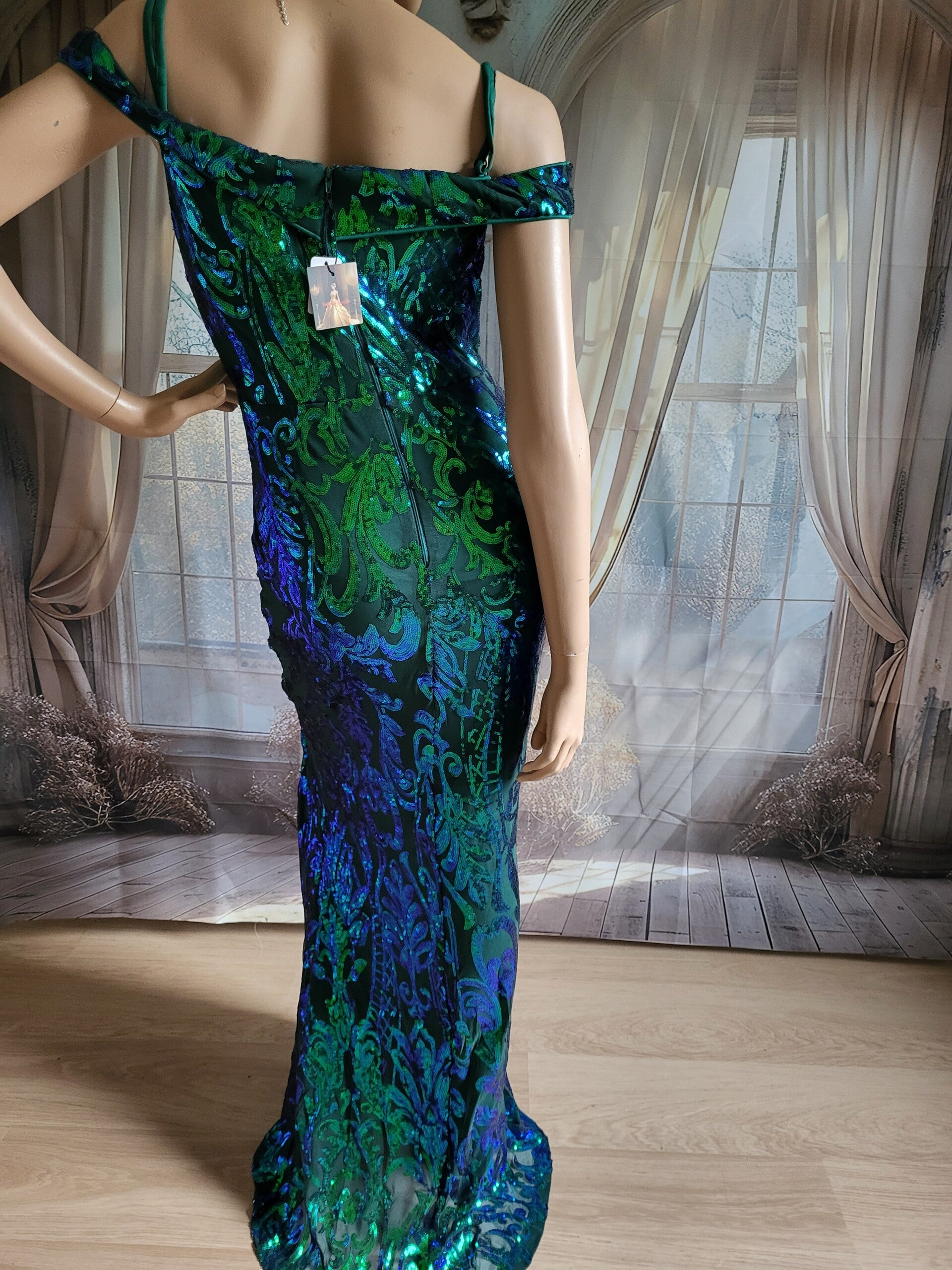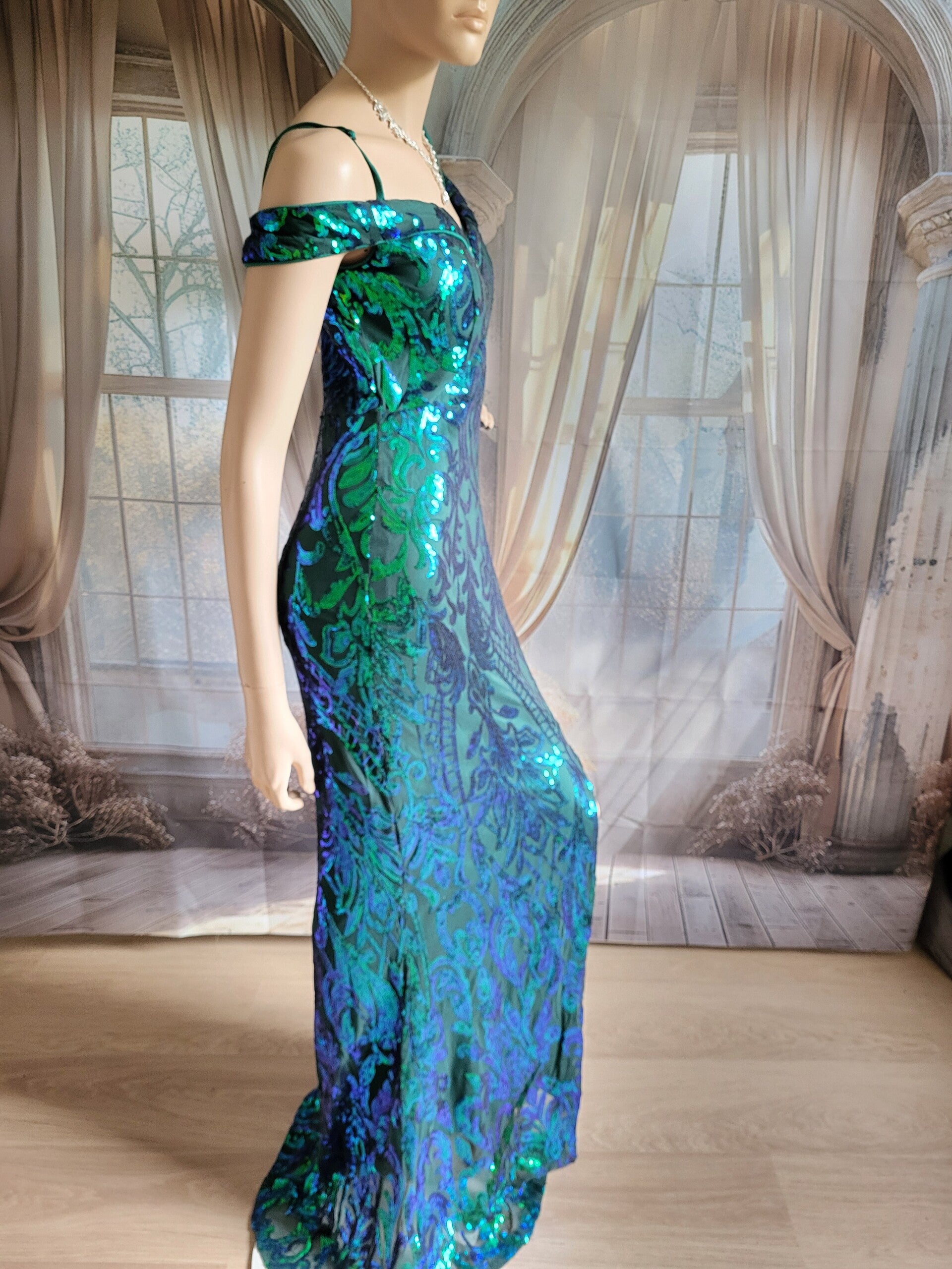 Groen-blauwe schitterende off - shoulder avondjurk 💚