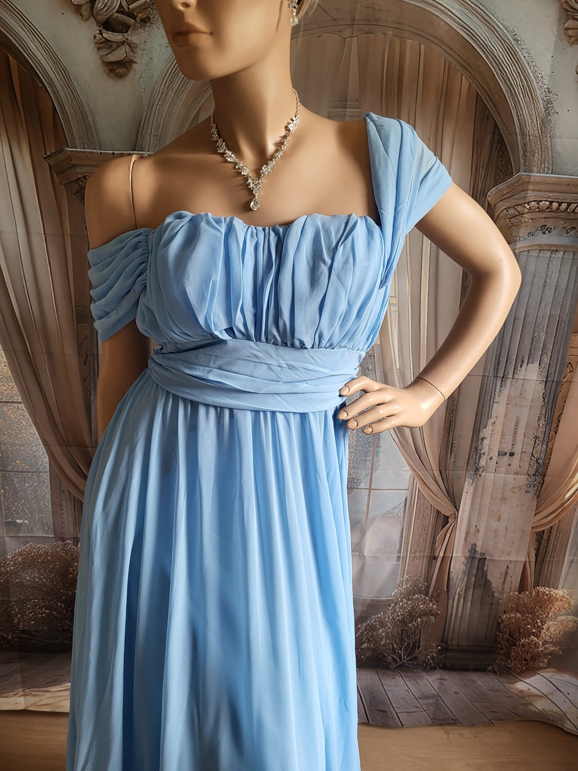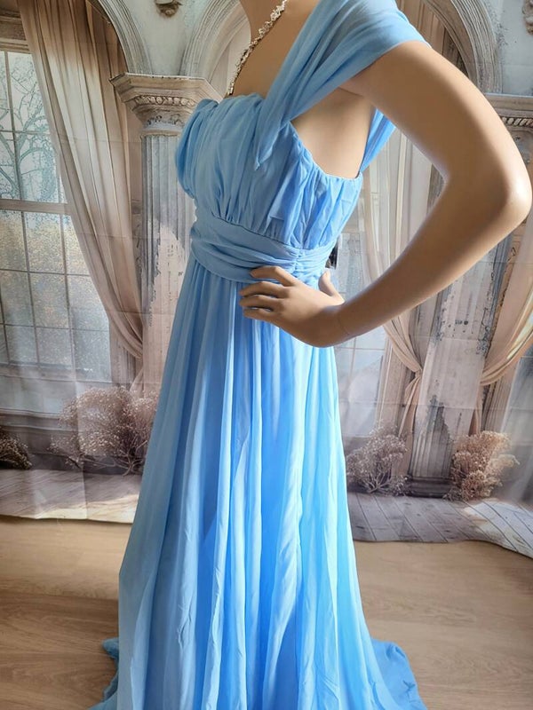 ‣ Ontdek de perfecte combinatie van stijl en comfort met onze nieuwe jurk! Gemaakt van 100% polyestervezel chiffon biedt deze jurk duurzaamheid en lichte elasticiteit voor een ideale pasvorm. De zachte lichtblauwe tint straalt elegantie uit, terwijl de off-shoulder kraag een romantische flair toevoegt. Met vloeiende plooien en een accentuerende tailleband is deze jurk perfect voor elke Formele gelegenheid. Maak een statement en voel je prachtig!