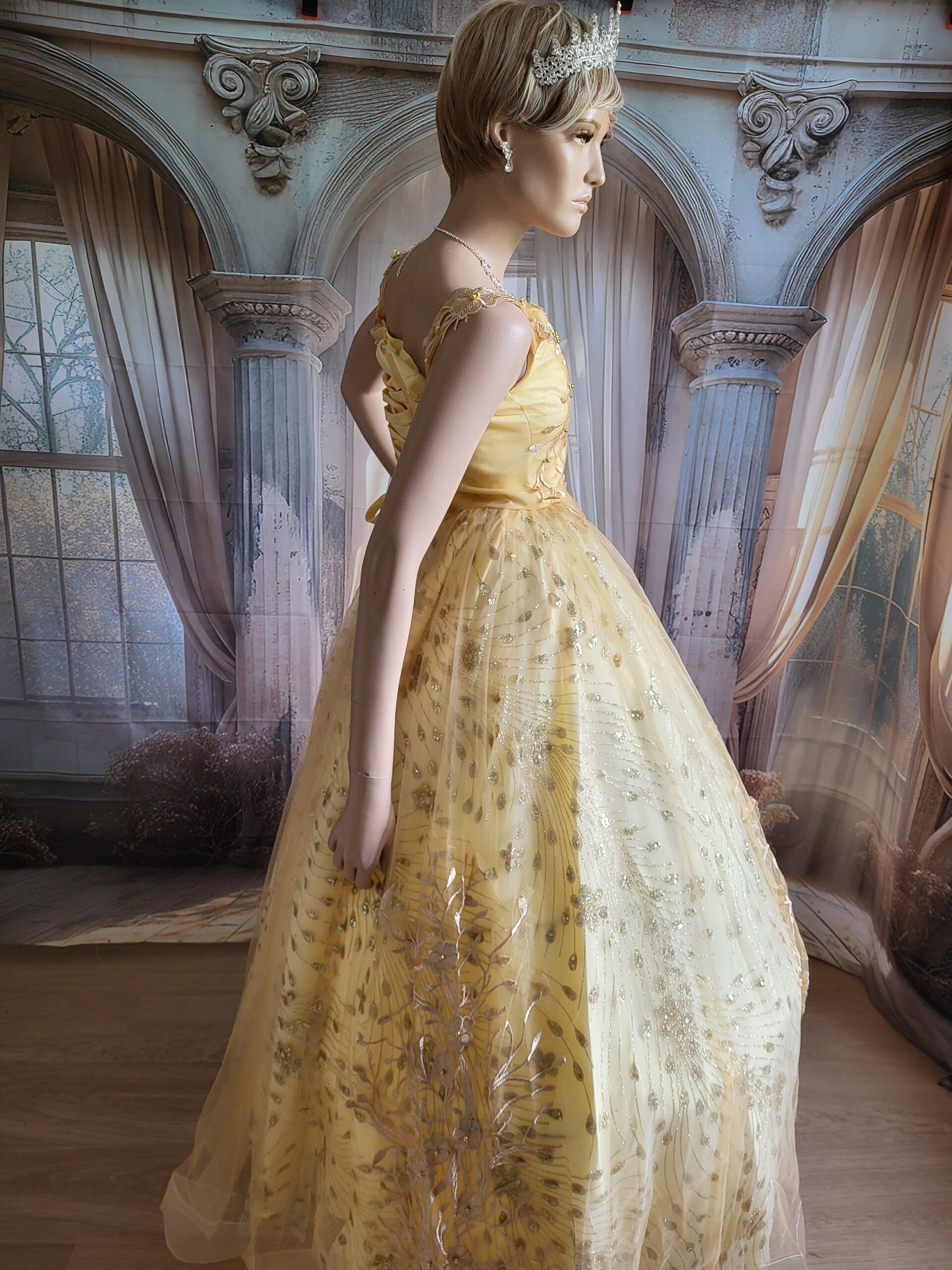 Maak een statement met onze prachtige jurk met petticoat! Deze elegante jurk in een zachte gele kleur met een lichte glans en gouden accenten is de perfecte keuze voor Formele gelegenheden. Het bovenstuk, rijkelijk versierd met gouden en crèmekleurige bloemenborduursels, geeft je een luxe uitstraling.De vol uitlopende rok, met glinsterende patronen en romantische bloemenmotieven, zorgt voor een betoverend silhouet. Met een praktische striksluiting aan de achterkant voor een perfecte pasvorm biedt deze jurk niet alleen stijl maar ook comfort. Gemaakt van duurzaam polyester, blijft deze jurk in topconditie, kreukvrij en met levendige kleuren. Voeg een vleugje elegantie toe aan je garderobe!