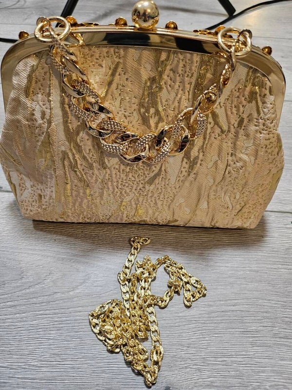 Het gouden gestreepte paillettenontwerp voegt een sprankelende flair toe, terwijl de luxe strass accenten een chique uitstraling geven. Gemaakt van kleurvaste stof in prachtige kaki, goud en beige tinten, biedt e deze tas genoeg ruimte voor zowel avond- als casual outfits.