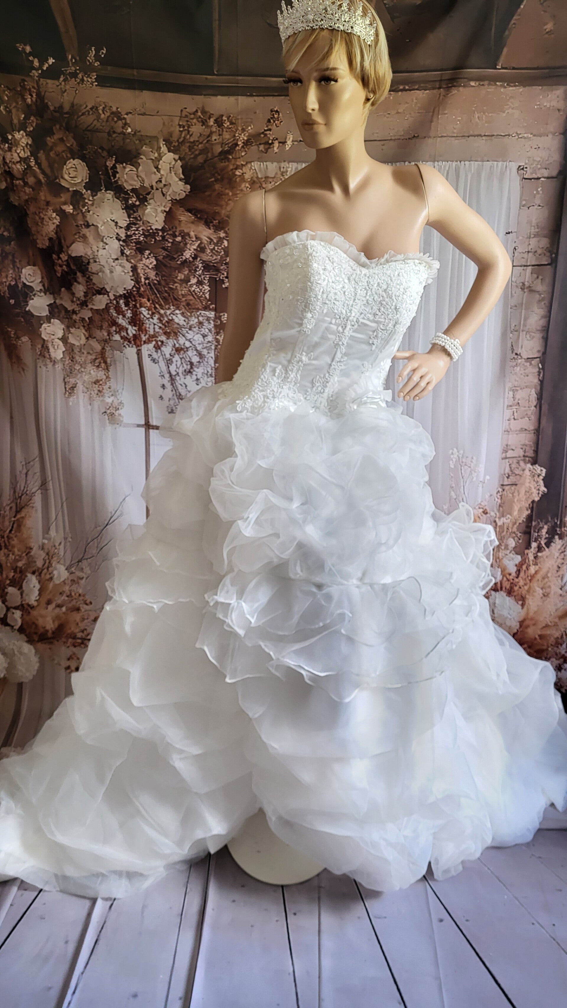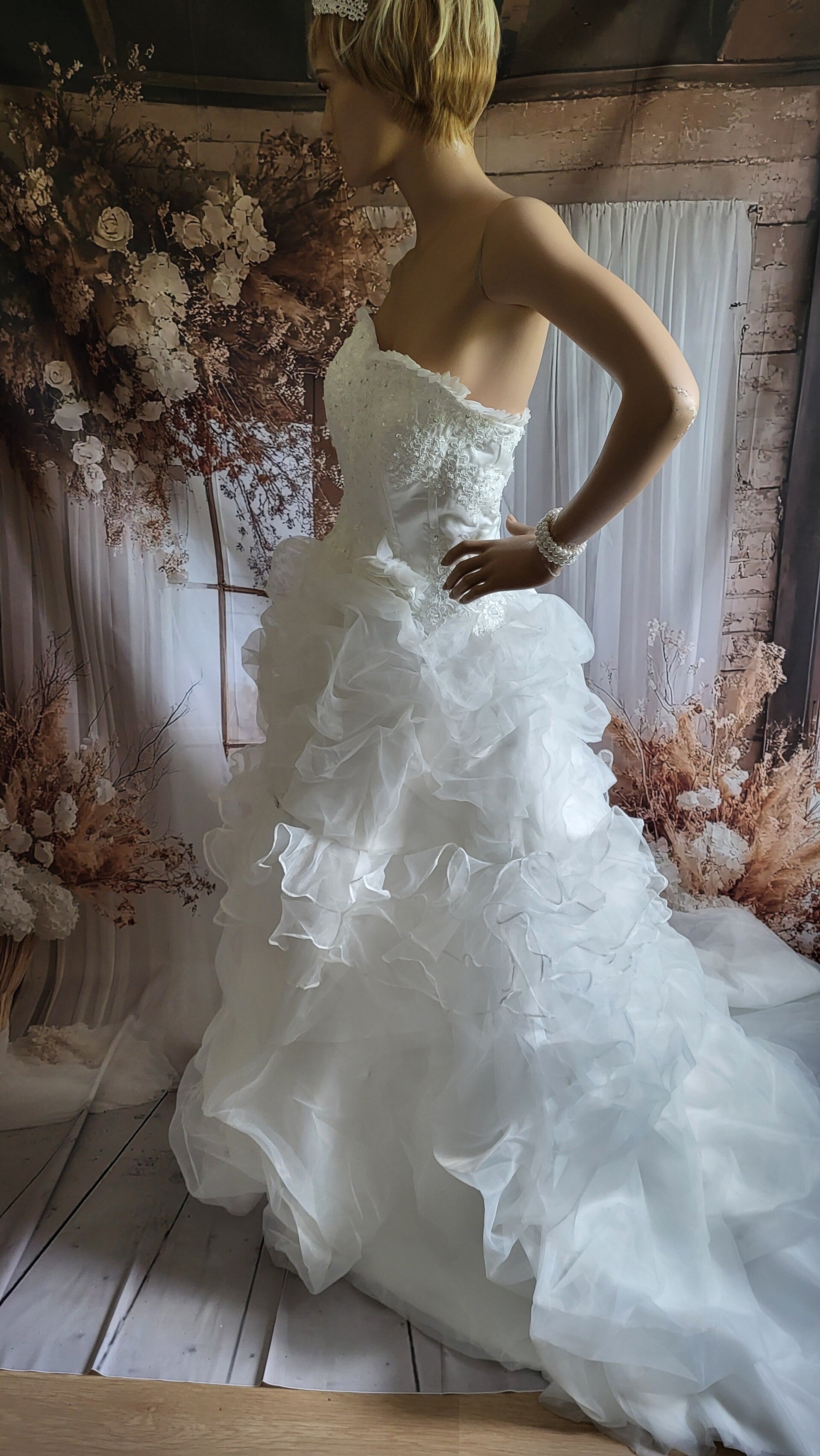 Maat Large, afmeting Borstomtrek 93 cm, tailleomtrek 75 cm, heupomtrek 101 cm. Lengte hol tot zoom 152 cm, hoogte 170 cm. ✨Droom je van de perfecte bruidslook? Deze 2-in-1 bruidsjurk is de belichaming van luxe en elegantie! Met een prachtige sweetheart halslijn en een rug van fijn kant met een stijlvolle vetersluiting, straalt ze klassieke romantiek uit. Gemaakt van hoogwaardig polyester, biedt de jurk een comfortabele en flatterende pasvorm.De vloerlange rok is verwijderbaar, waardoor je kunt kiezen voor een traditionele of meer casual look. Het vintage fashion element voegt een tijdloze charme toe, perfect voor een klassieke bruiloft. Met een gelaagde rok die zorgt voor een volumineus effect en een corset dat is afgewerkt met prachtige borduursels en kristallen, is deze jurk een echte showstopper!👰💖